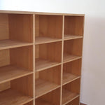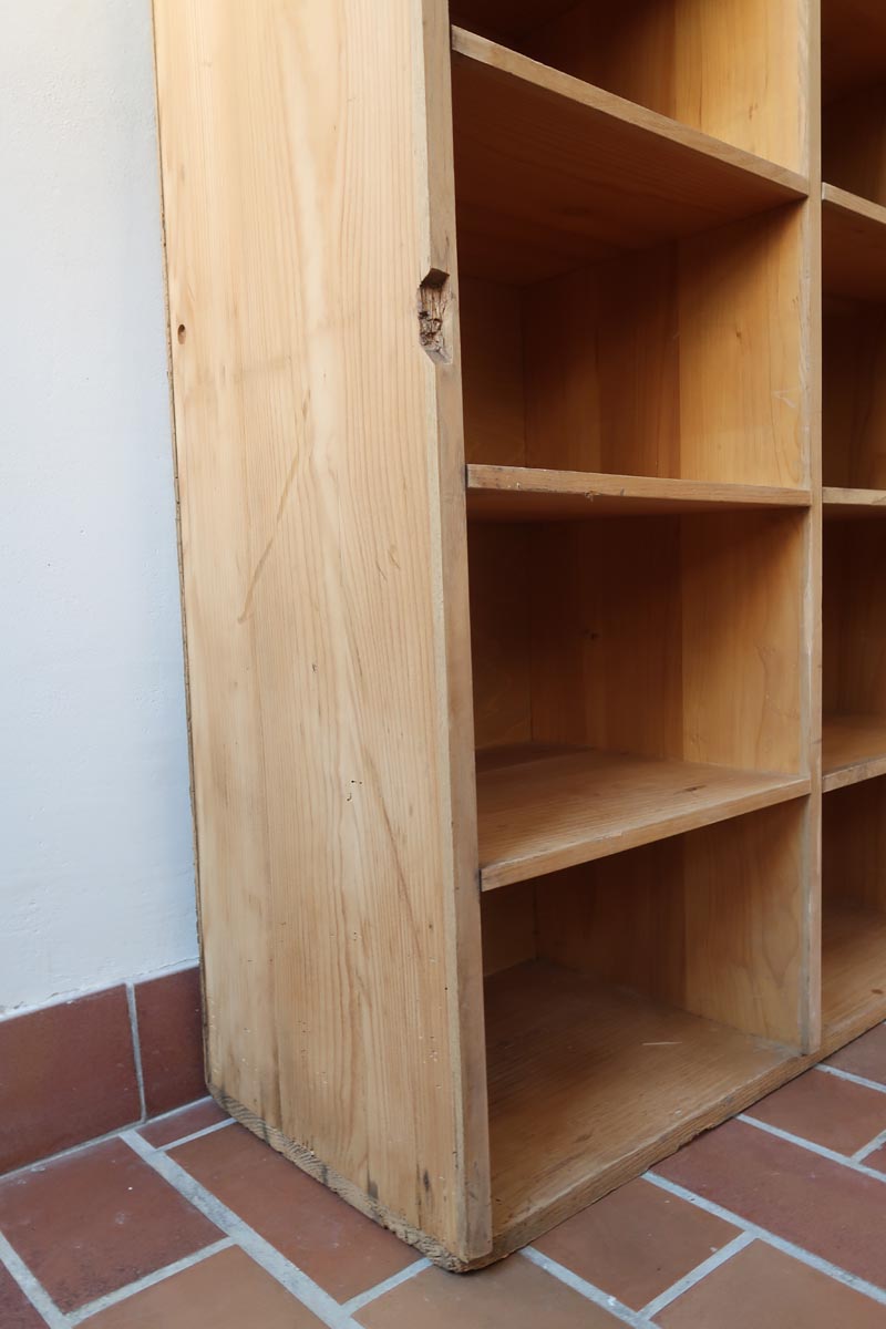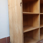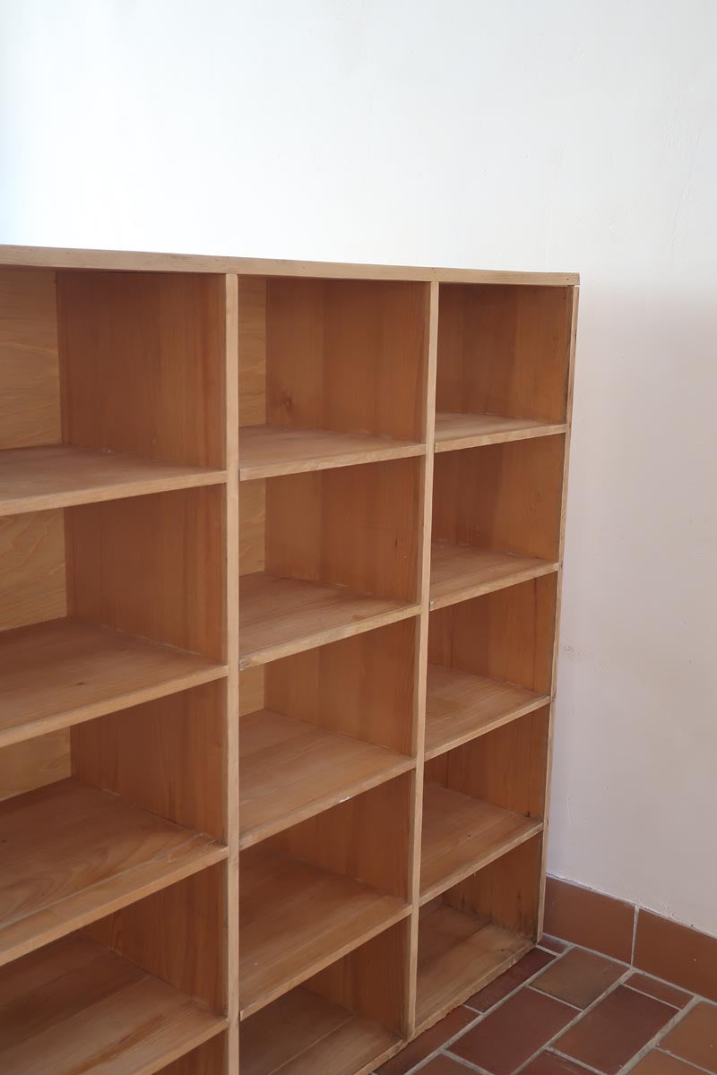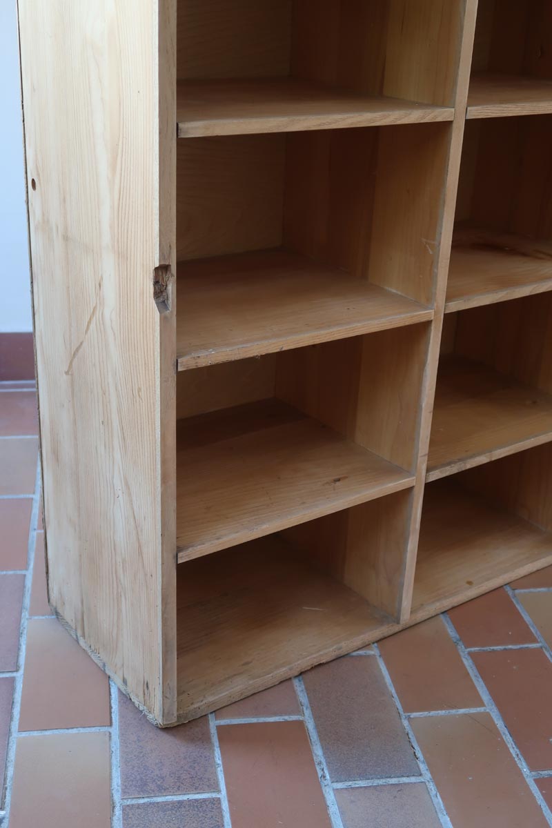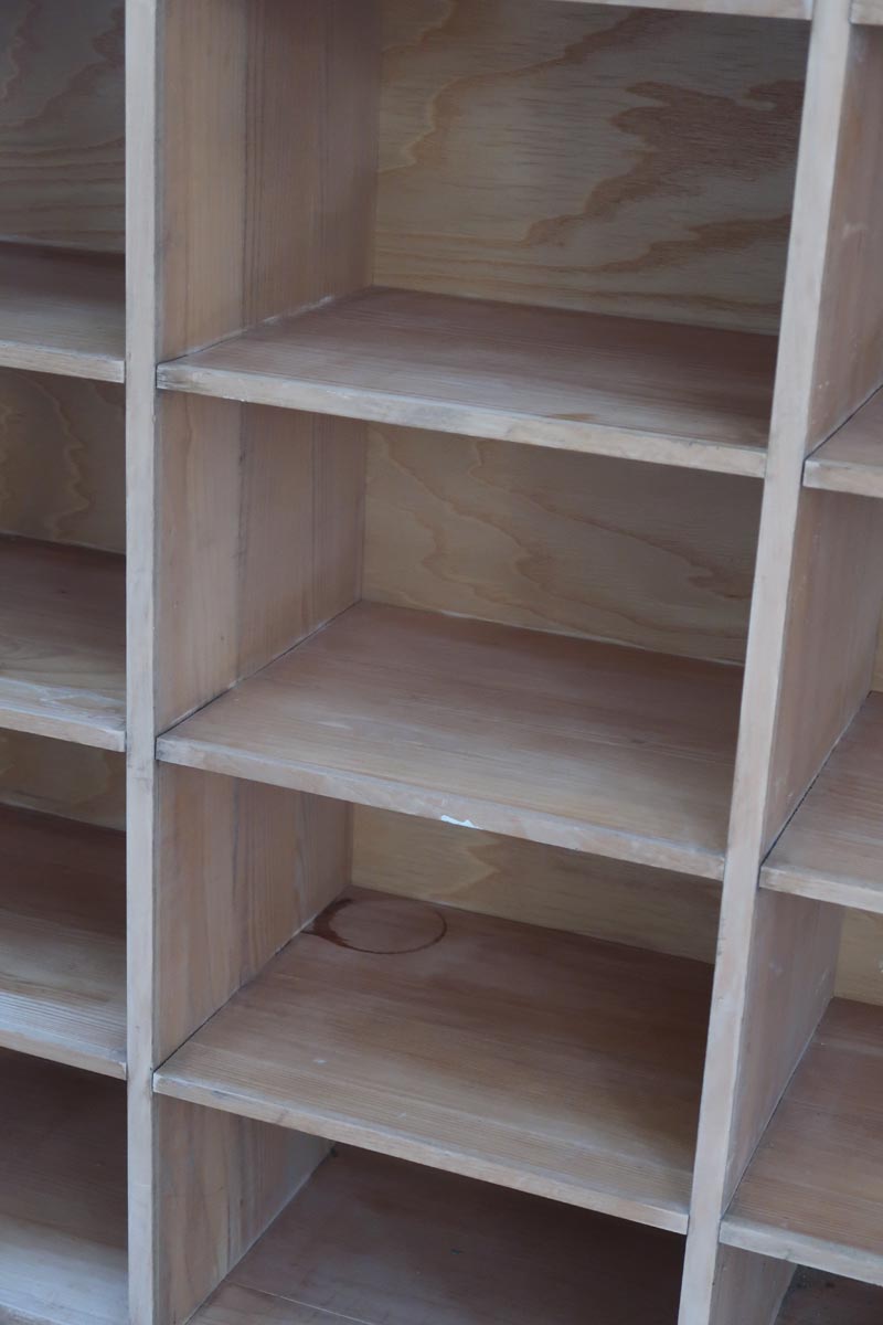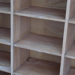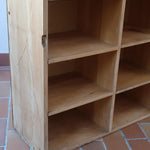 Grand meuble à casiers vintage en bois clair, au design brut et fonctionnel, idéal pour un intérieur de style atelier, industriel ou scandinave épuré.