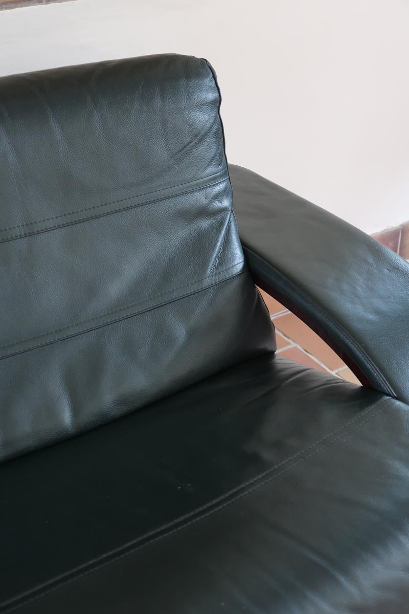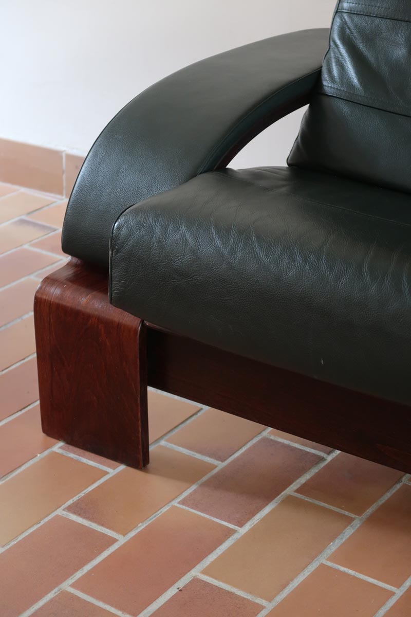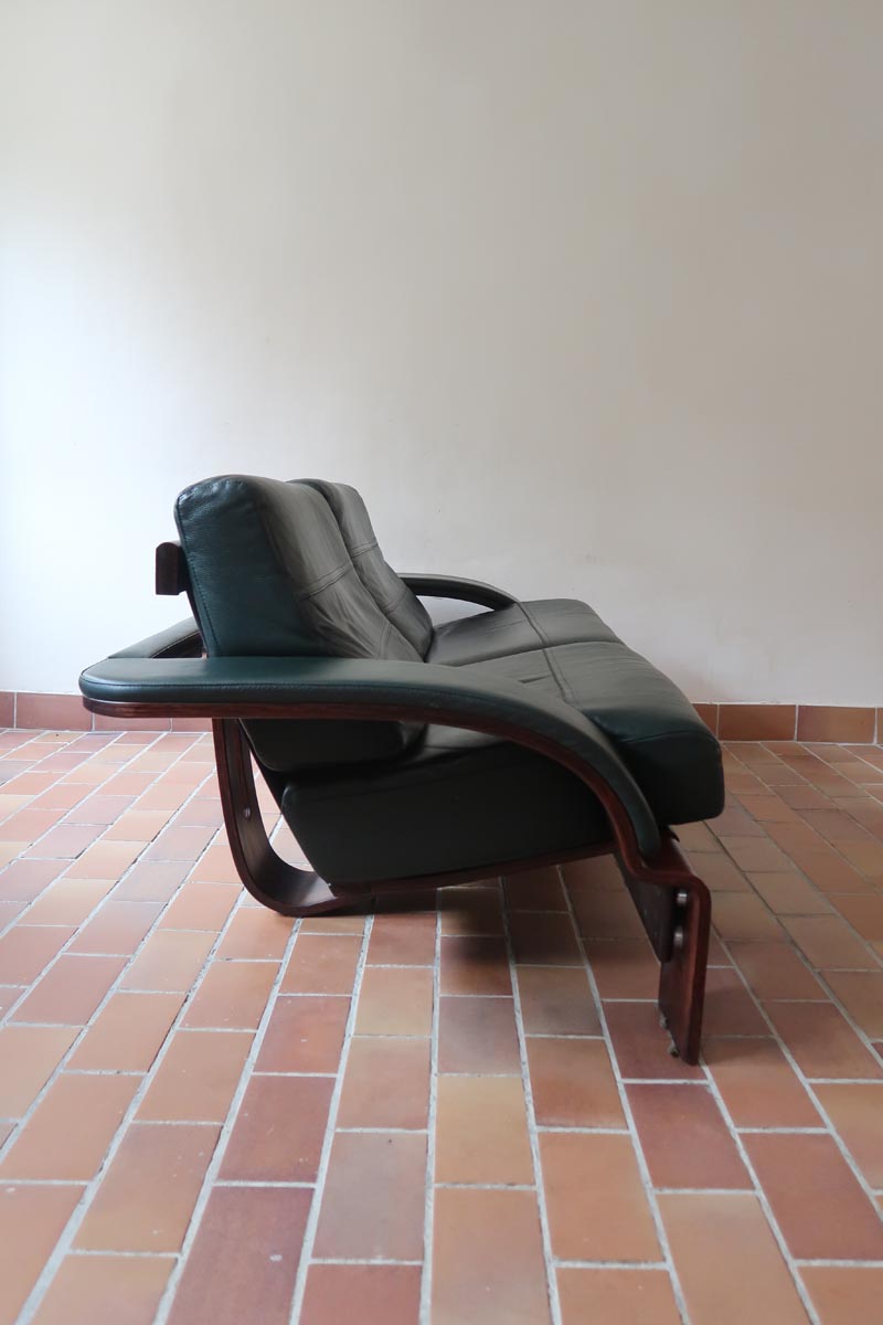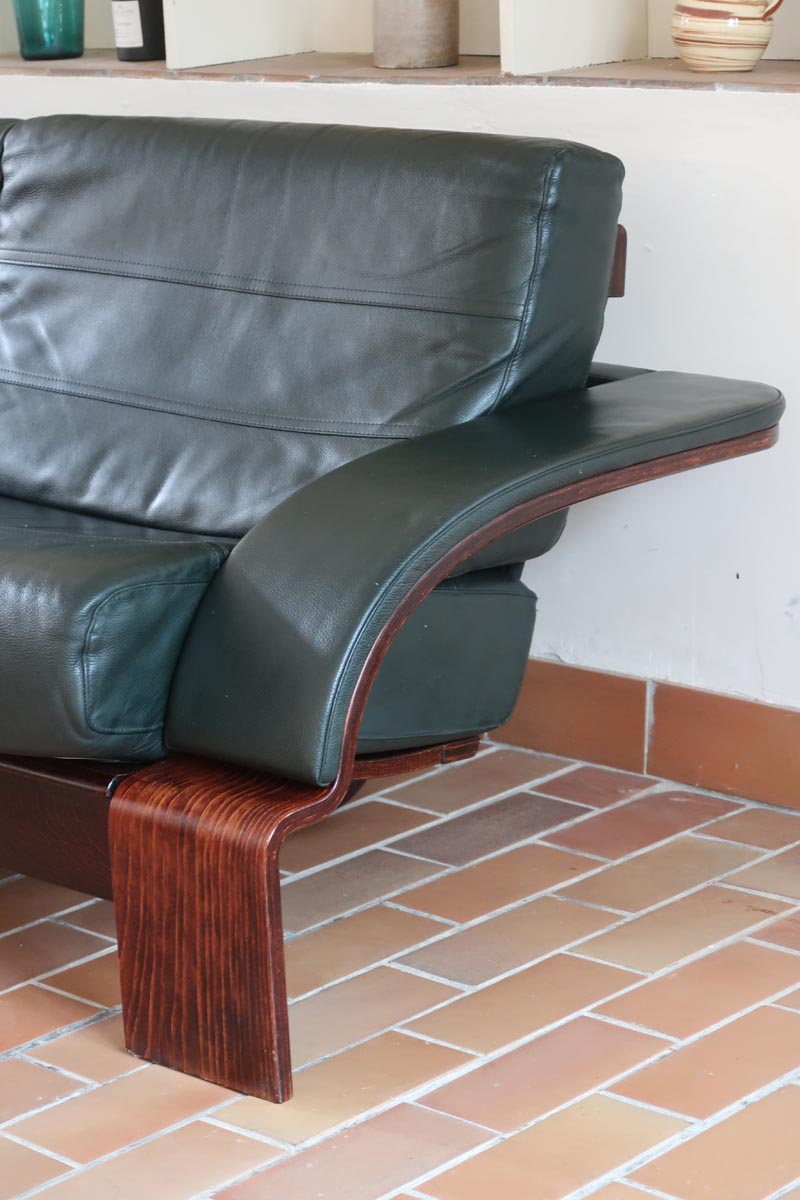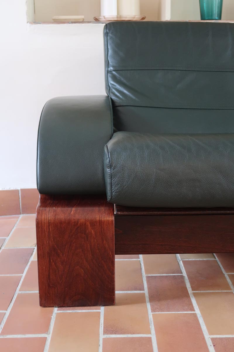 Icône du design scandinave des années 70, le modèle Kroken a été dessiné par le designer suédois Åke Fribytter et édité en France par Roche Bobois. On reconnaît immédiatement sa structure en bois massif aux lignes courbes et son assise en cuir vert profond, à la fois confortable et enveloppante.