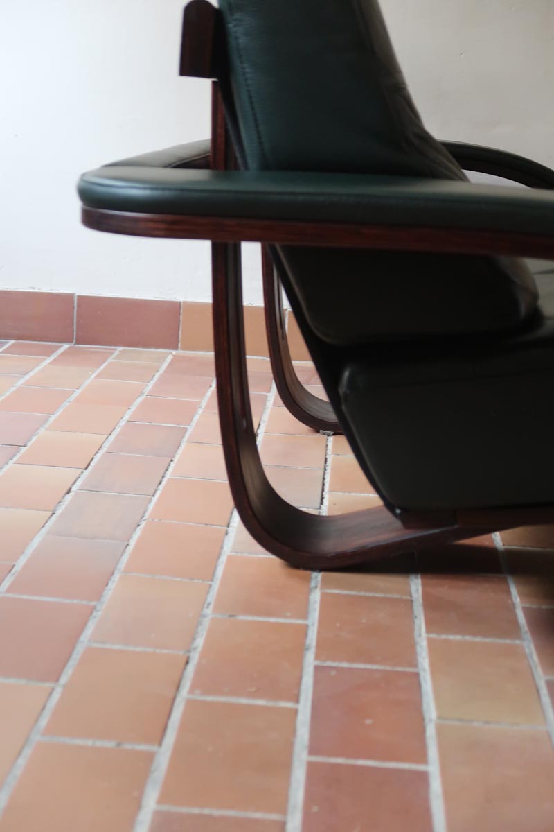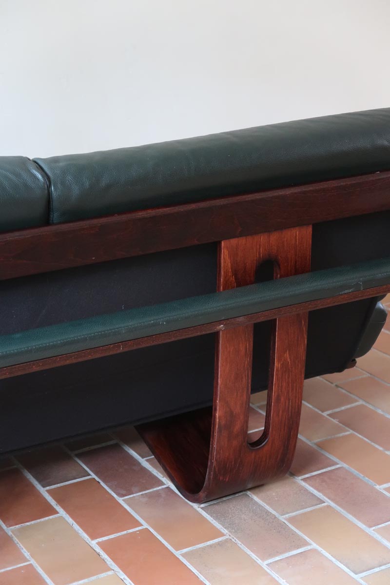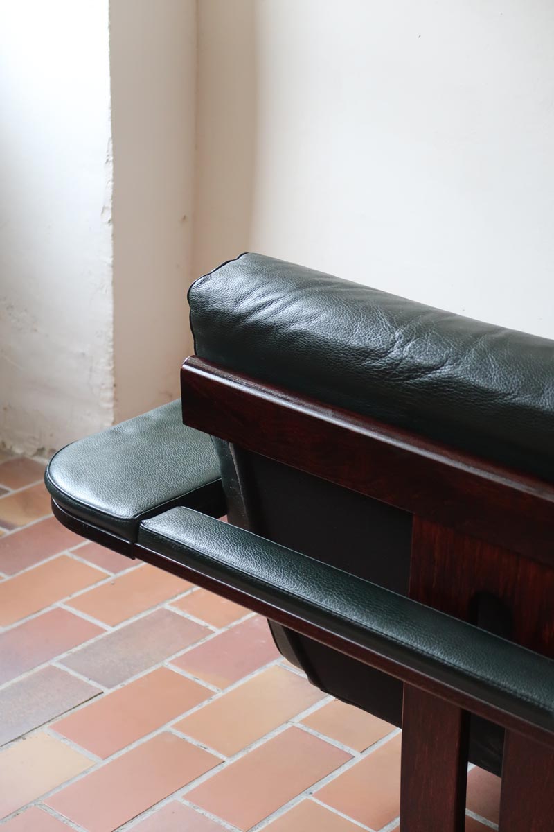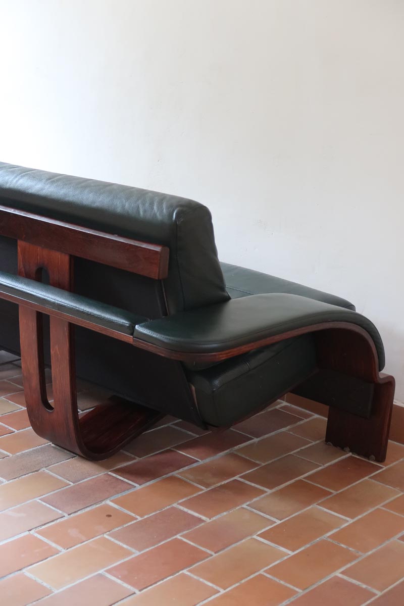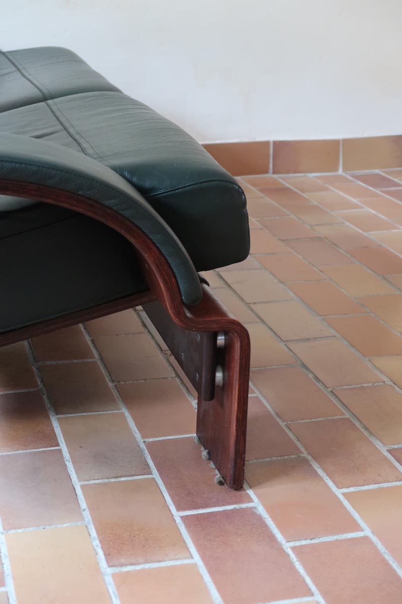 Icône du design scandinave des années 70, le modèle Kroken a été dessiné par le designer suédois Åke Fribytter et édité en France par Roche Bobois. On reconnaît immédiatement sa structure en bois massif aux lignes courbes et son assise en cuir vert profond, à la fois confortable et enveloppante.