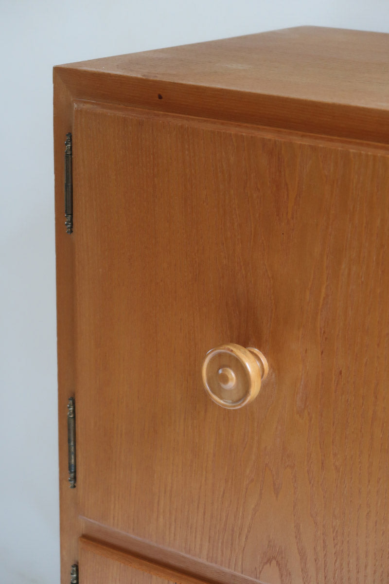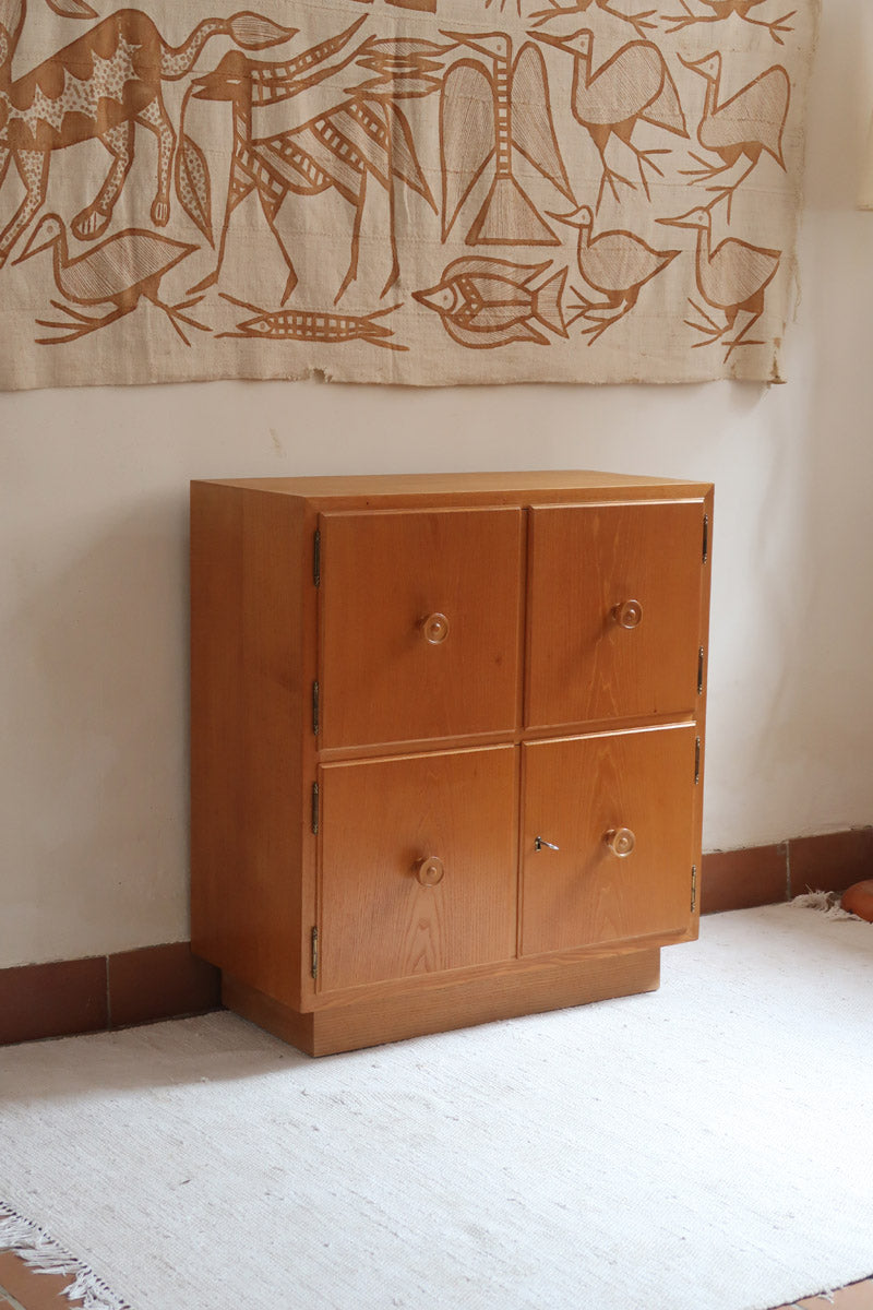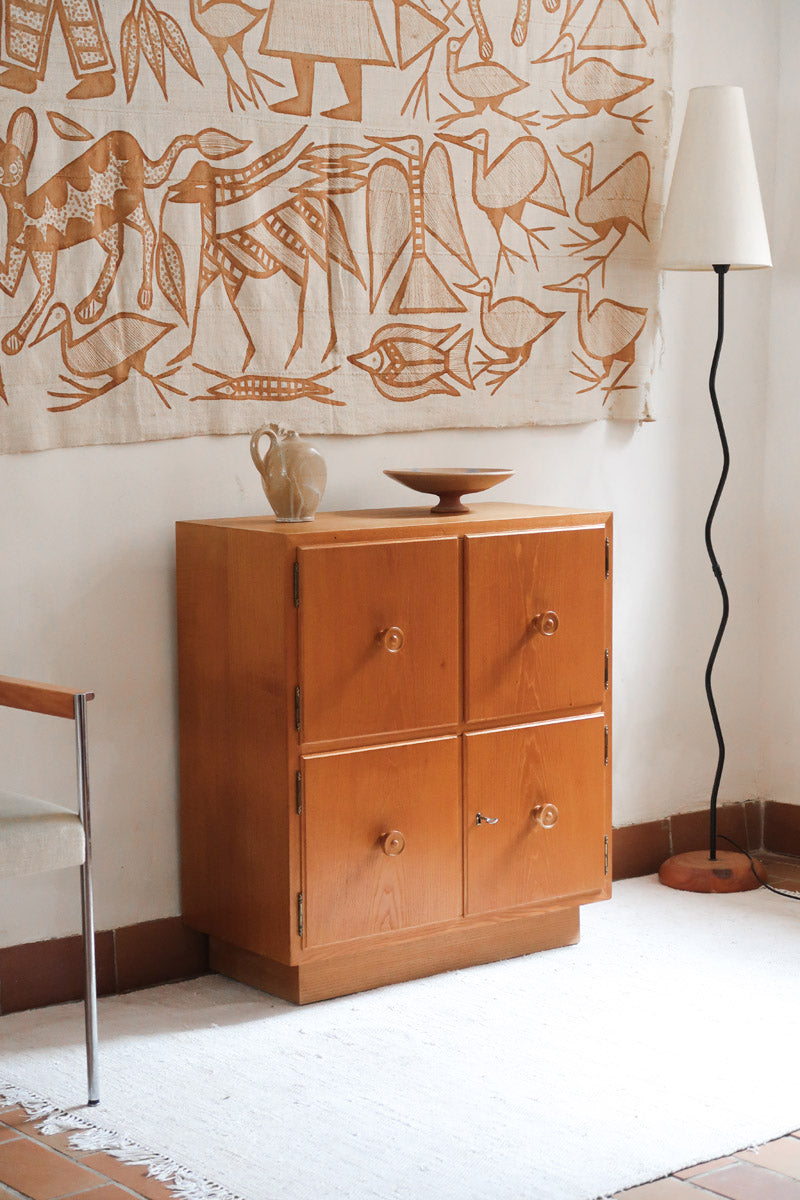 Commode scandinave en pin blond des années 70 avec quatre portes à boutons tournés.