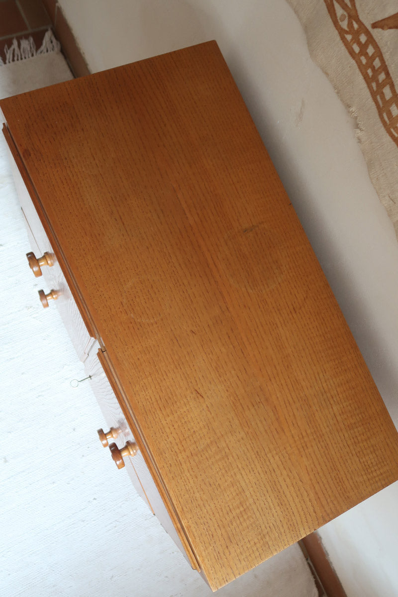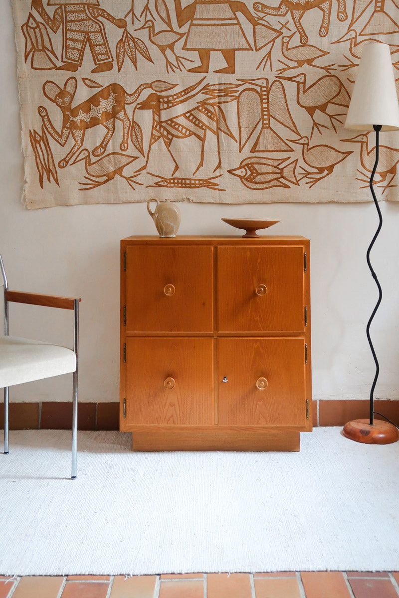 Une petite commode scandinave tout en pin blond, typique des années 70, avec ses quatre portes à boutons tournés et son format compact ultra-pratique. Son design simple et chaleureux en fait une pièce facile à intégrer : chambre, entrée ou salon, elle apporte immédiatement une touche authentique et lumineuse.