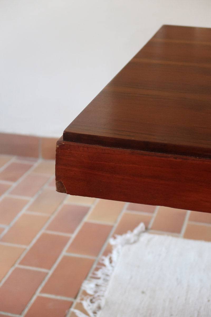 La base sculpturale affirme une présence forte tout en restant équilibrée, faisant de cette table une pièce centrale aussi bien en salle à manger qu’en grand bureau. Le bois présente une patine homogène et cohérente avec l’âge, mettant en valeur les volumes et les lignes.