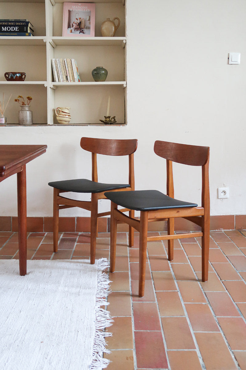 Paire de chaises scandinaves Farstrup en teck avec assise retapissée en skaï noir, design danois des années 60.