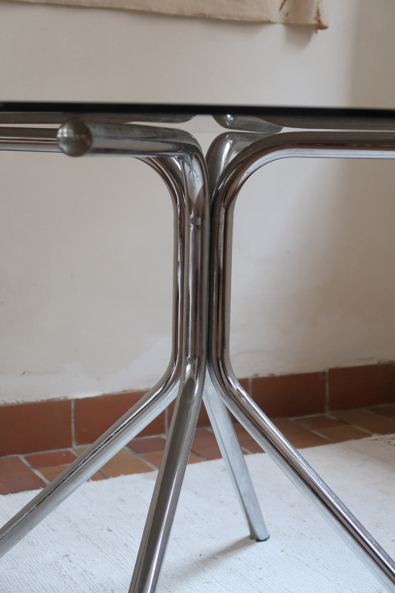 Table ronde en verre fumé et piètement chromé – design années 70