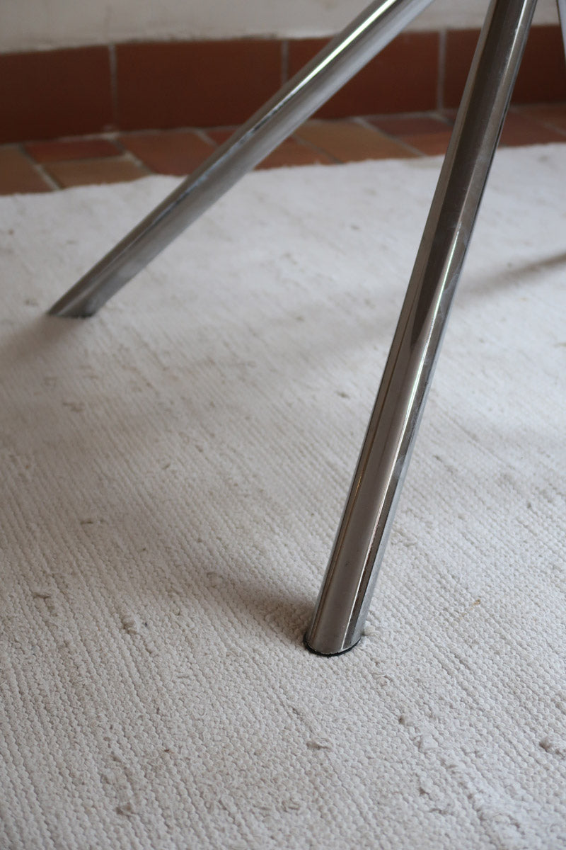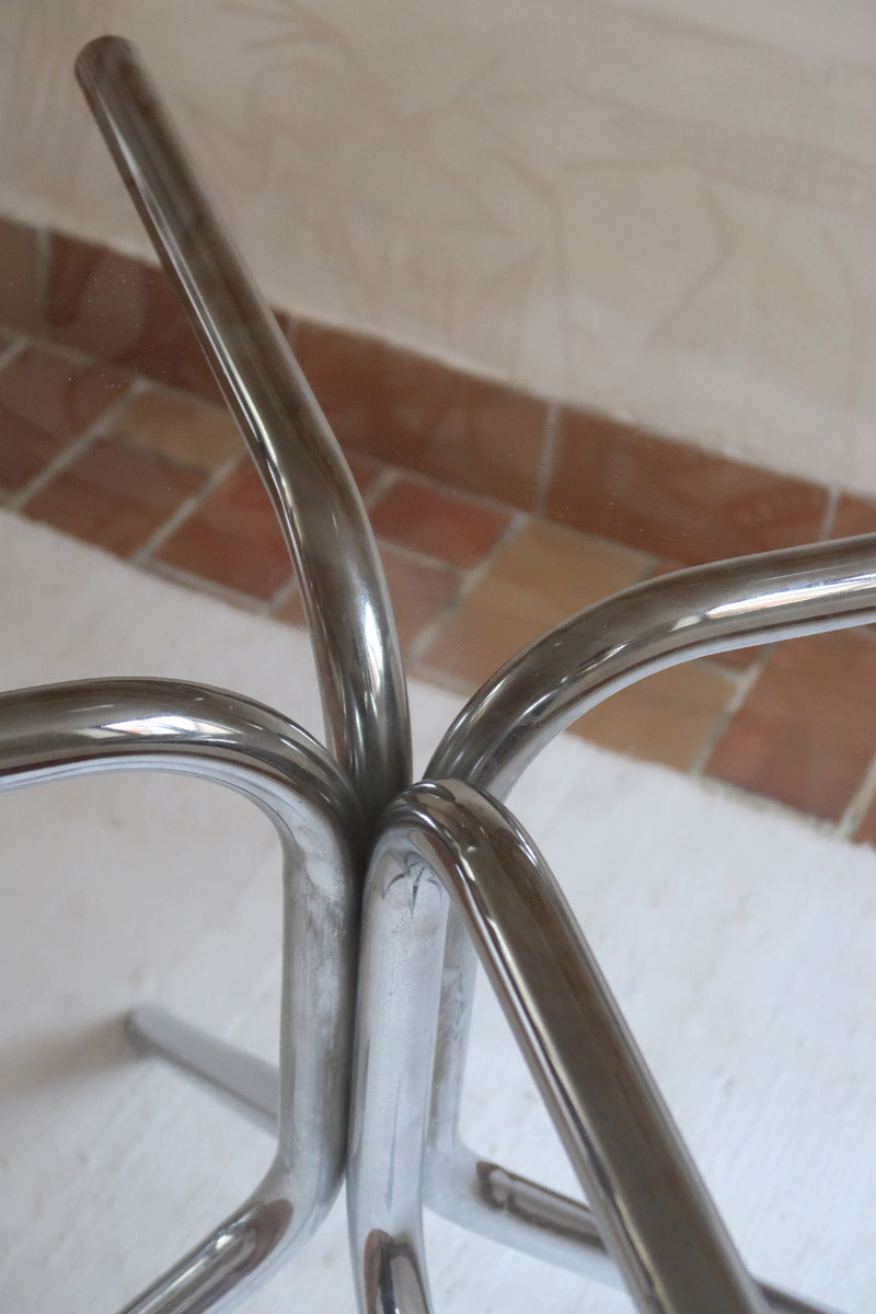 Une table ronde au look typiquement 70's, avec un plateau en verre fumé qui apporte transparence et caractère, posé sur un piètement en chrome sculptural à quatre branches. Une silhouette légère, élégante, parfaite pour moderniser un coin repas ou une petite salle à manger.