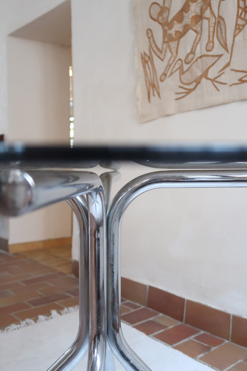 Le verre présente quelques marques d’usage discrètes, le chrome reste brillant, et l’ensemble offre une vraie présence sans alourdir l’espace. Une pièce iconique de l’esthétique des années 70, idéale pour ceux qui aiment les lignes graphiques et les matériaux lumineux.